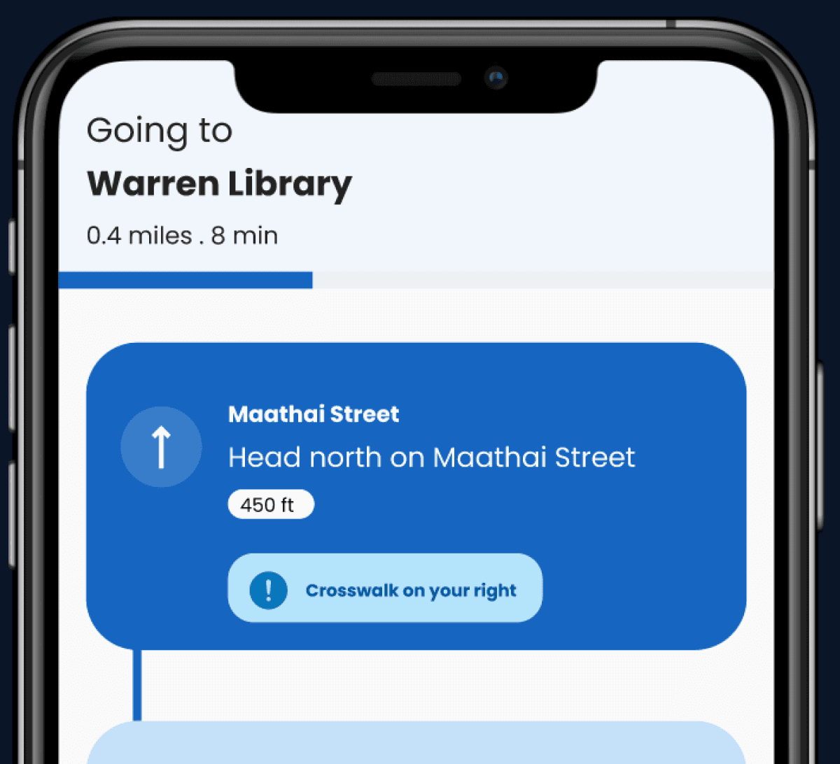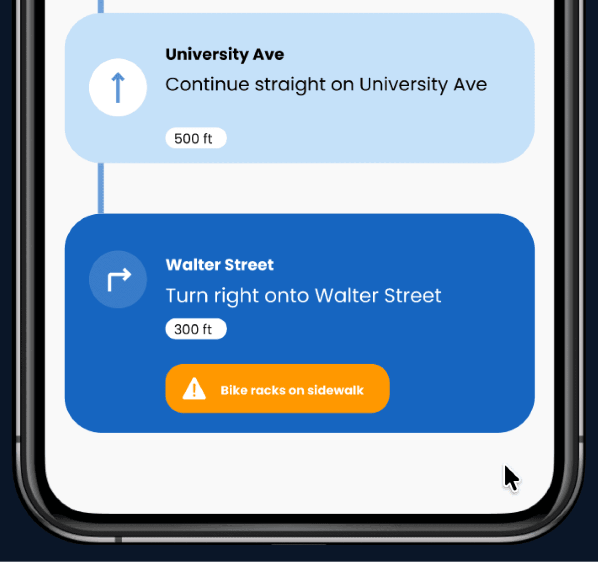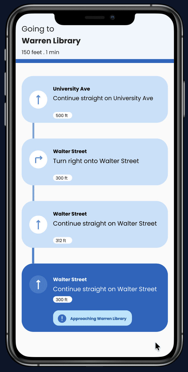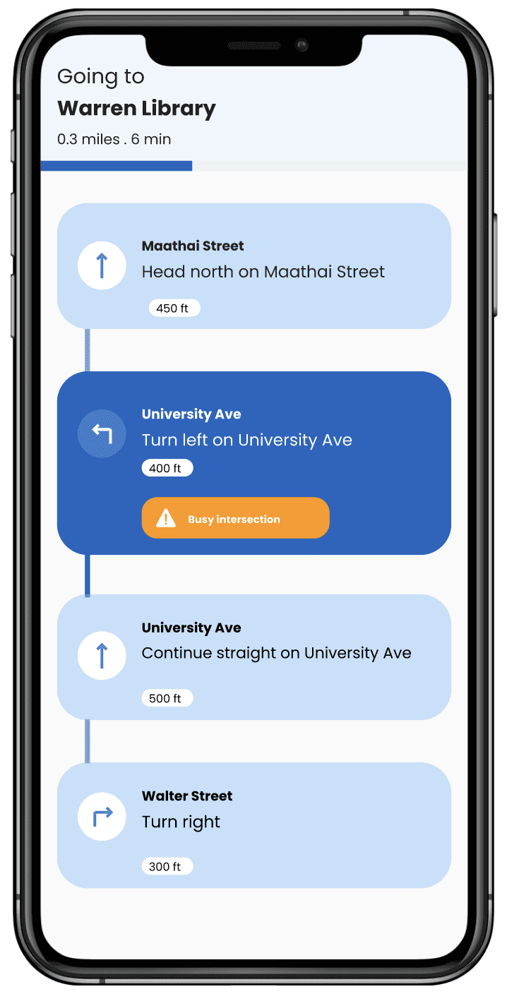 We redesigned for much safer navigation by including clear audio directions, haptic feedback (phone vibrations) to confirm turns and signal obstacles, along with spatial cues to help users understand their surroundings 10986