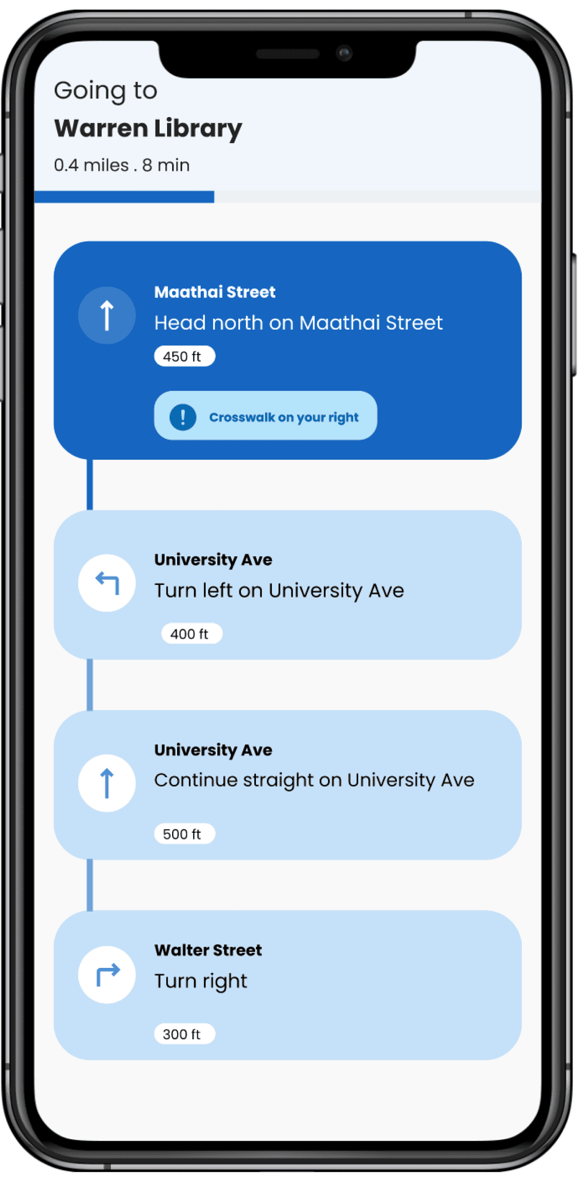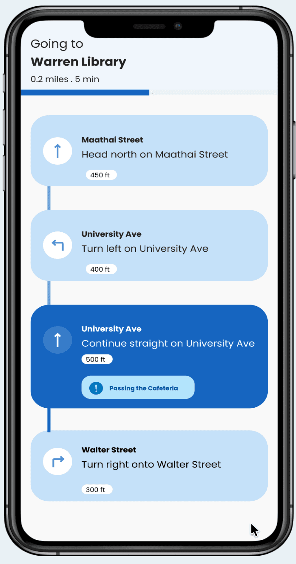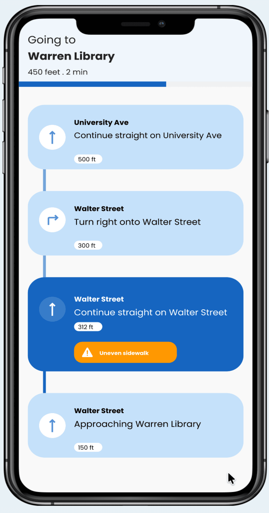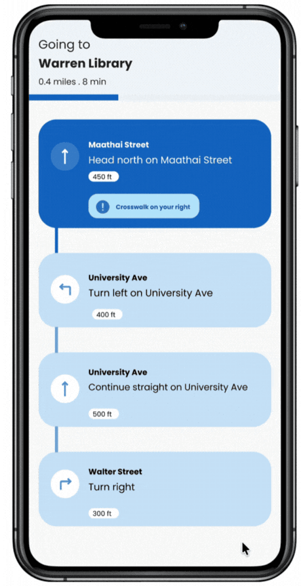 We redesigned for much safer navigation by including clear audio directions, haptic feedback (phone vibrations) to confirm turns and signal obstacles, along with spatial cues to help users understand their surroundings 10986