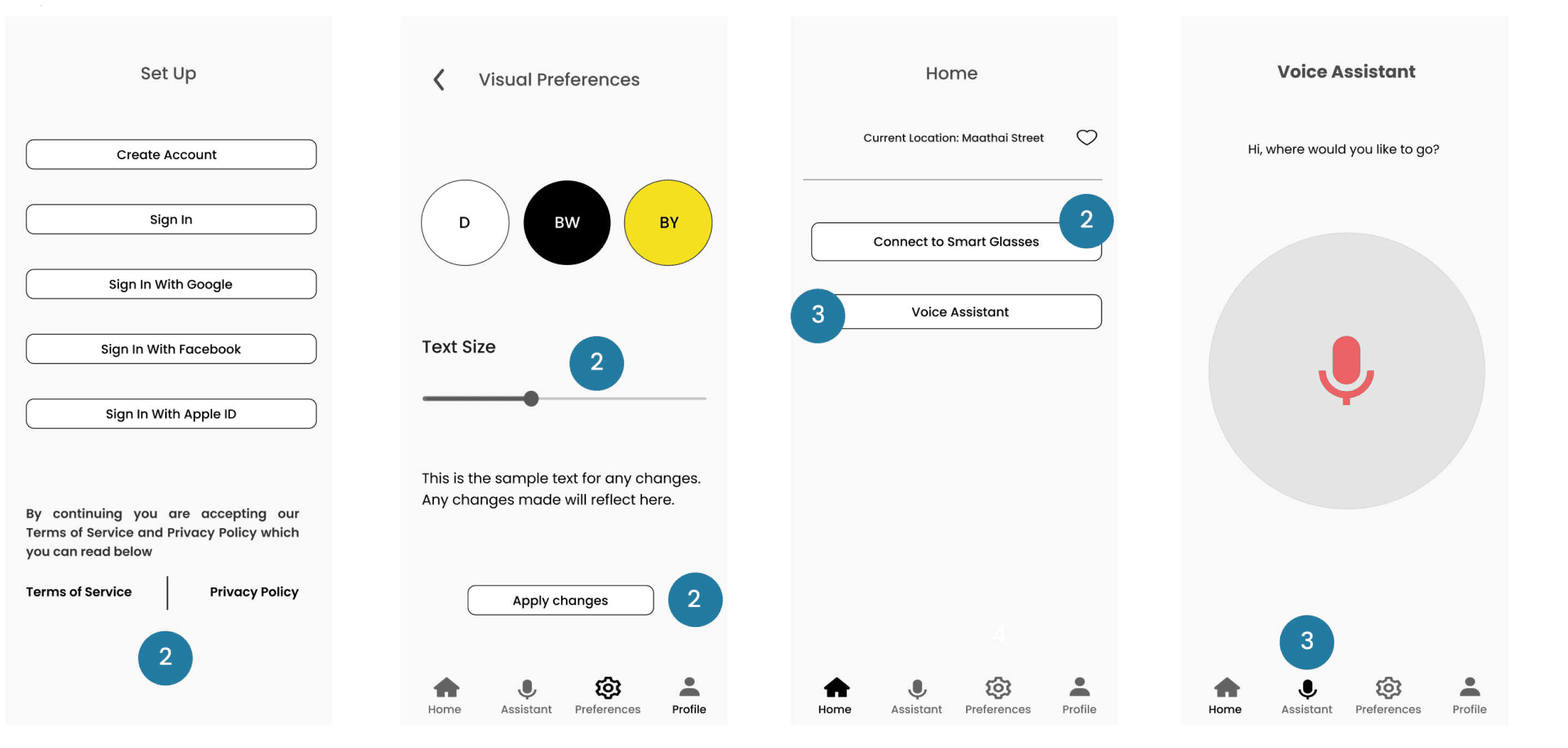 The first iteration of the app had a visual onboarding flow, touch controls, and a voice-enabled navigation assistant.